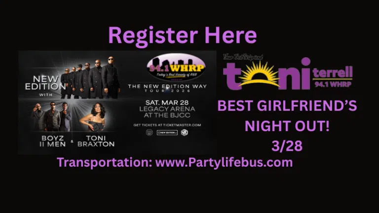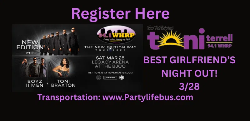 Register for a chance to WIN 2-tickets for Toni Terrell's 'Best Girlfriend's Night Out'! To See the New Edition Way Tour and special guest Boyz II Men & Toni Braxton. Saturday March 28, 2026 at the Legacy Arena BJCC in Birmingham. Each winner is encouraged to bring your Best Girlfriend for a magical night of fun! T…